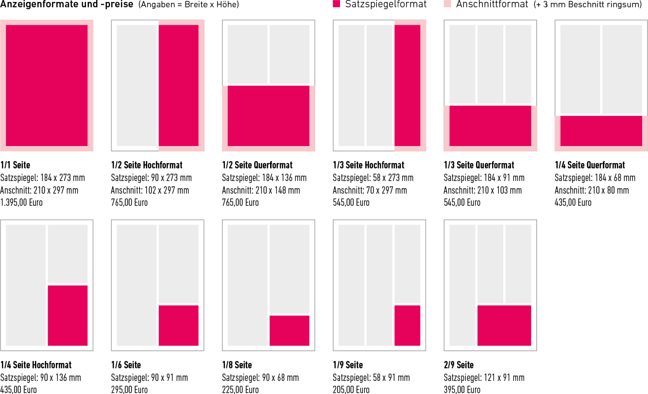 Die Formate 1/2 Seite quer oder 1/1 Seite sind jeweils auch als Advertorial, komplett oder mit Anzeigenkombination, buchbar. Gerne informieren wir Sie zu den Voraussetzungen und Konditionen.