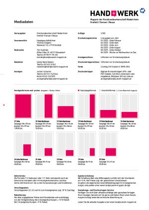 Mit Ihrem Inserat bei HAND+WERK sichern Sie sich einen Platz in bester Gesellschaft und die Aufmerksamkeit von unseren Lesern aus den ersten Reihen der Wirtschaft – dem Handwerk am Niederrhein sowie wichtigen Multiplikatoren und Entscheidern aus Politik, Verwaltung und Öffentlichkeit in unserer Region.